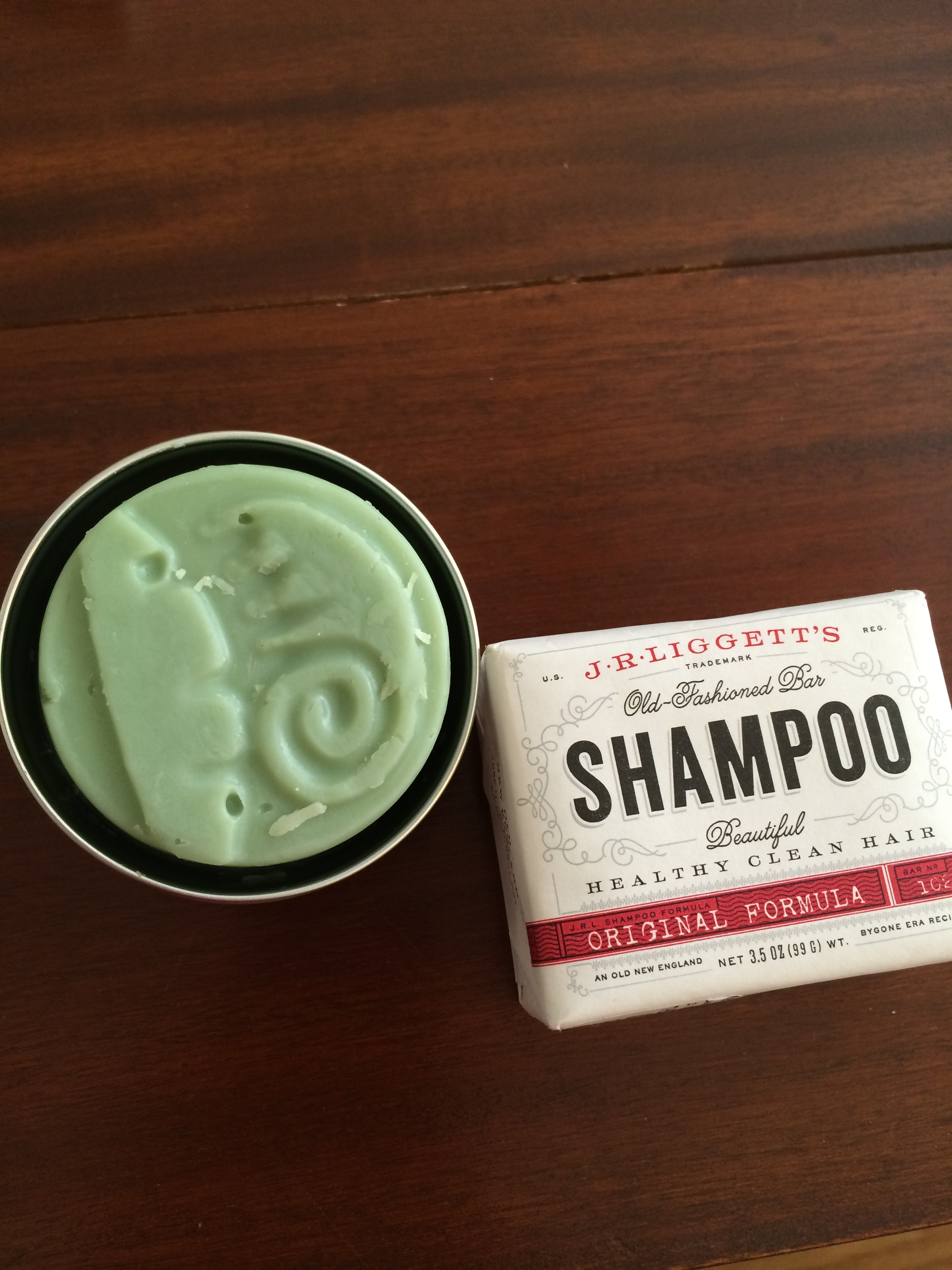 When I stopped at Merz to pick up the Rosebud lip balm, I asked about shampoos and conditioners not in plastic. The staff person recommended this bar shampoo, J.R. Liggett’s, which she said she uses (it was about $7/bar and is advertised to last about the same amount of time as a 24-oz. bottle of shampoo). I have actually not yet tried it (more on that in a moment), but the Merz lady said she loves this shampoo. Several friends have also suggested that I visit a Lush store to get hair products, and the green conditioner in the picture above is from there. I have yet to use this conditioner, too, but from the rave reviews I’ve heard, it feels promising.