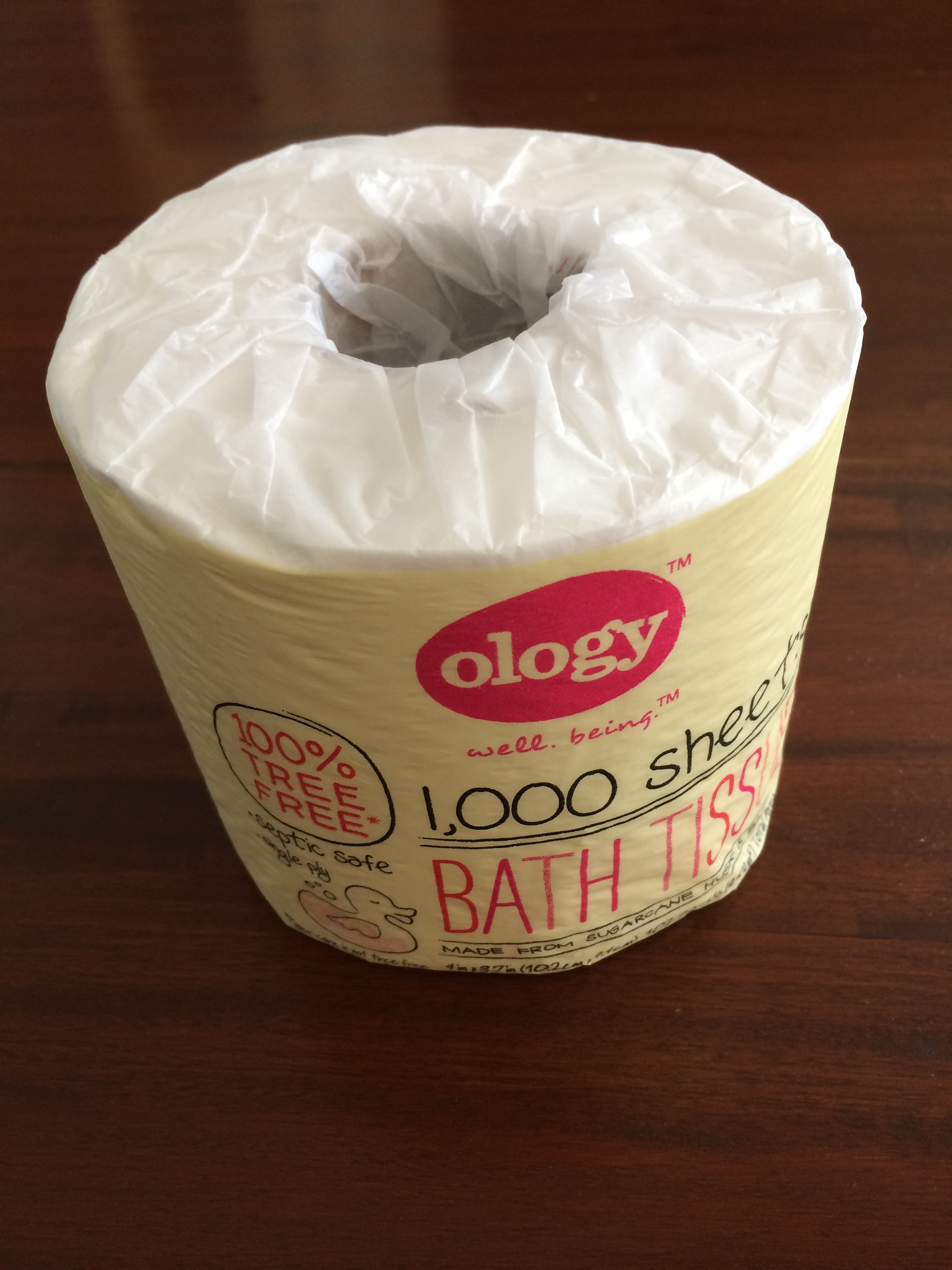 Since tissue is so often packaged in groups (say four packs), it usually comes in plastic. At Walgreens, I’ve found this brand called “ology” that sells tissue by the roll in a paper sleeve. The sleeve is made of bamboo instead of tree pulp, so it claims to be non-harmful to forests, and after doing a bit of research, I’m not finding any negatives about this producer. So, for the time being, I’m going to continue buying these rolls. They can be a little comical to carry (I’ve done some unexpected juggling on my way to the check out line), but they usually cost about $1/roll, so I’m not seeing much of a price difference between these and the tissue packed in groups.